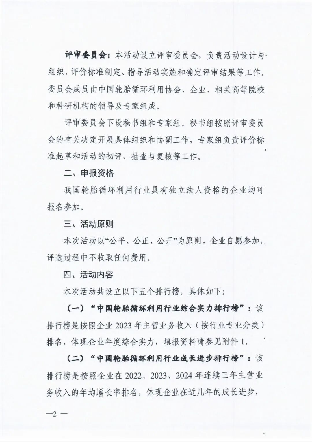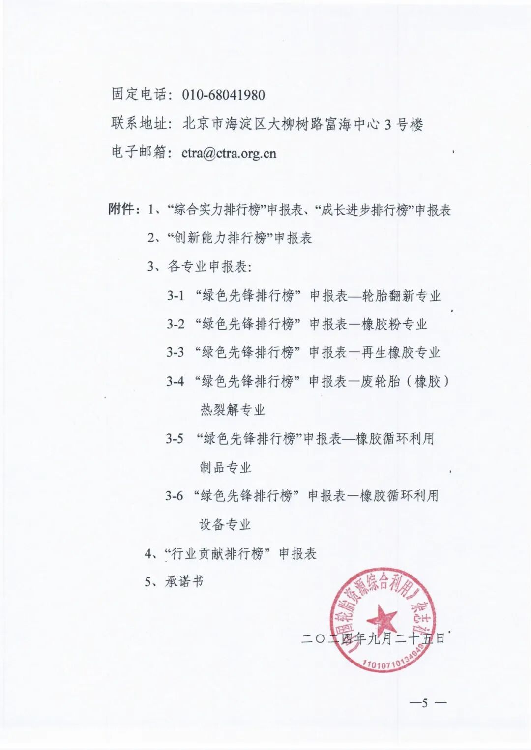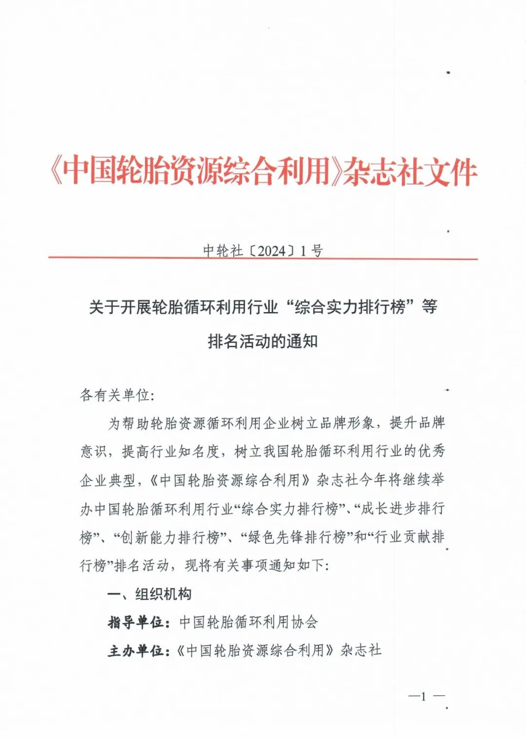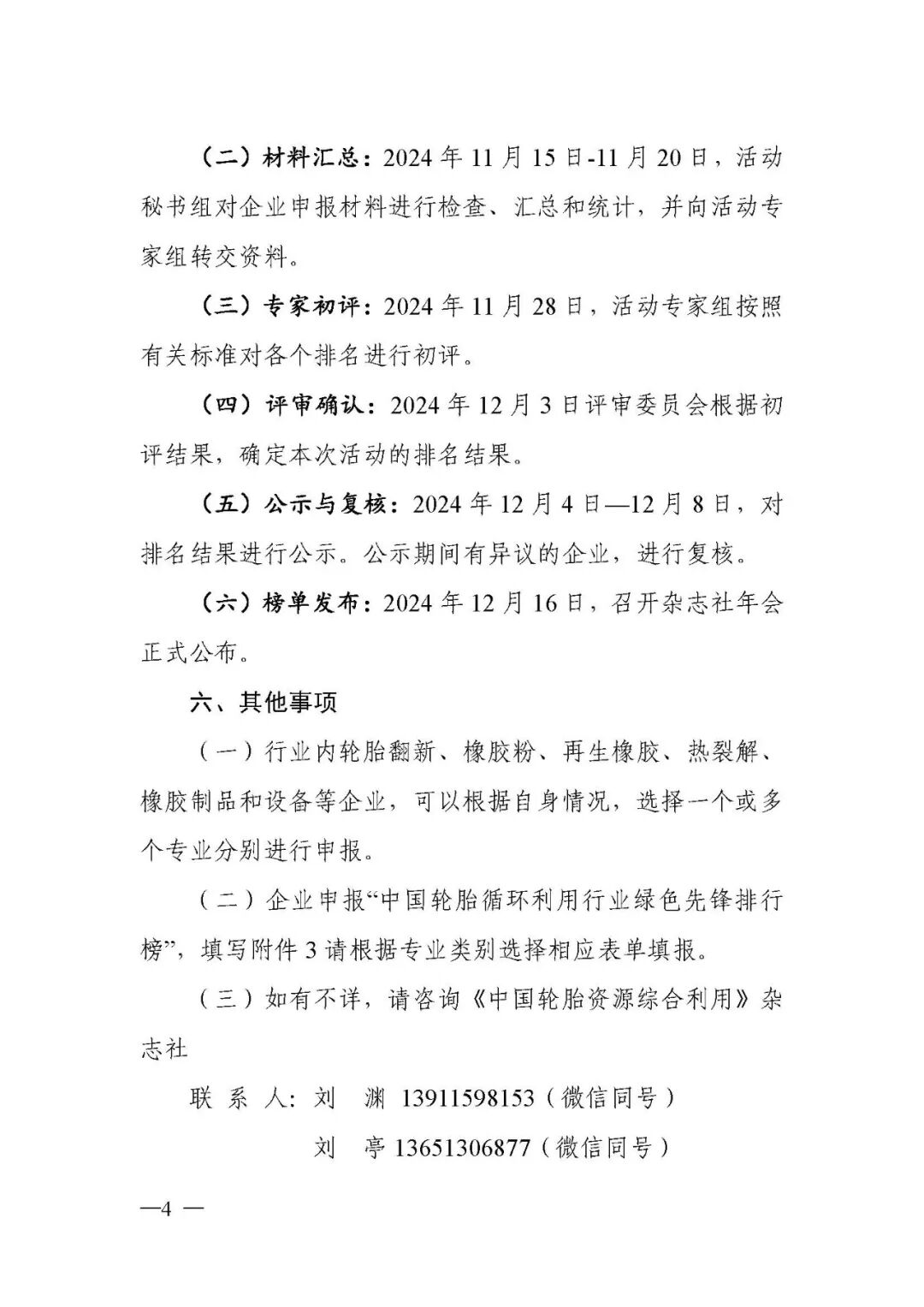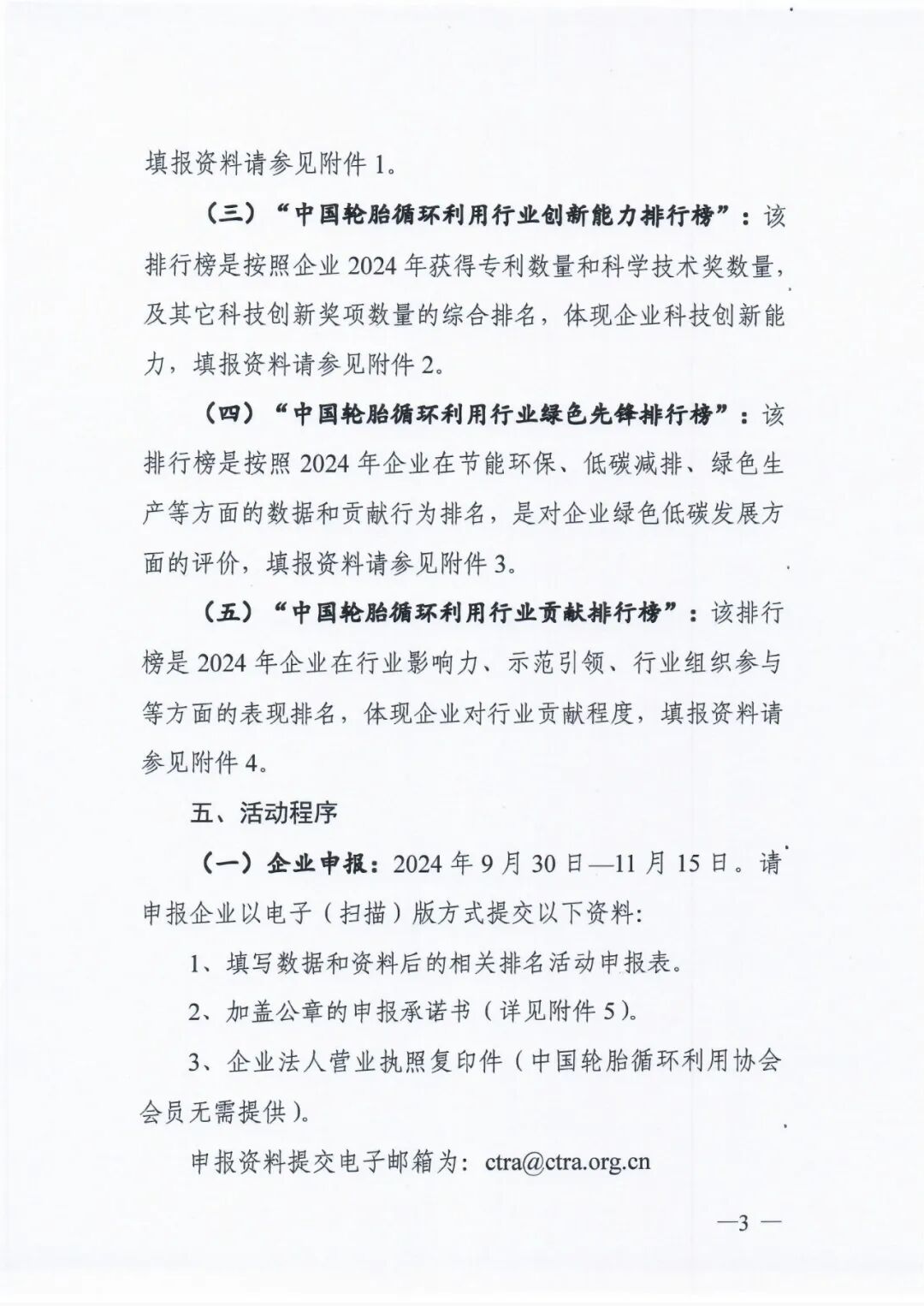为帮助轮胎资源循环利用企业树立品牌形象,提升品牌意识,提高行业知名度,树立我国轮胎循环利用行业的优秀企业典型,《中国轮胎资源综合利用》杂志社今年将继续举办中国轮胎循环利用行业“综合实力排行榜”“成长进步排行榜”“创新能力排行榜”“绿色先锋排行榜”和“行业贡献排行榜”排名活动,现将有关事项通知如下:评审委员会:本活动设立评审委员会,负责活动设计与组织、评价标准制定、指导活动实施和确定评审结果等工作。委员会成员由中国轮胎循环利用协会、企业、相关高等院校和科研机构的领导及专家组成。评审委员会下设秘书组和专家组。秘书组按照评审委员会的有关决定开展具体组织和协调工作,专家组负责评价标准起草和活动的初评、抽查与复核等工作。我国轮胎循环利用行业具有独立法人资格的企业均可报名参加。本次活动以“公平、公正、公开”为原则,企业自愿参加,评选过程中不收取任何费用。(一)“中国轮胎循环利用行业综合实力排行榜”:该排行榜是按照企业2023年主营业务收入(按行业专业分类)排名,体现企业年度综合实力,填报资料请参见附件1。(二)“中国轮胎循环利用行业成长进步排行榜”:该排行榜是按照企业在2022、2023、2024年连续三年主营业务收入的年均增长率排名,体现企业在近几年的成长进步,填报资料请参见附件1。(三)“中国轮胎循环利用行业创新能力排行榜”:该排行榜是按照企业2024年获得专利数量和科学技术奖数量,及其它科技创新奖项数量的综合排名,体现企业科技创新能力,填报资料请参见附件2。(四)“中国轮胎循环利用行业绿色先锋排行榜”:该排行榜是按照2024年企业在节能环保、低碳减排、绿色生产等方面的数据和贡献行为排名,是对企业绿色低碳发展方面的评价,填报资料请参见附件3。(五)“中国轮胎循环利用行业贡献排行榜”:该排行榜是2024年企业在行业影响力、示范引领、行业组织参与等方面的表现排名,体现企业对行业贡献程度,填报资料请参见附件4。(一)企业申报:2024年9月30日—11月15日。请申报企业以电子(扫描)版方式提交以下资料:3、企业法人营业执照复印件(中国轮胎循环利用协会会员无需提供)。申报资料提交电子邮箱为:ctra@ctra.org.cn(二)材料汇总:2024年11月15日-11月20日,活动秘书组对企业申报材料进行检查、汇总和统计,并向活动专家组转交资料。(三)专家初评:2024年11月28日,活动专家组按照有关标准对各个排名进行初评。(四)评审确认:2024年12月3日评审委员会根据初评结果,确定本次活动的排名结果。(五)公示与复核:2024年12月4日—12月8日,对排名结果进行公示。公示期间有异议的企业,进行复核。(六)榜单发布:2024年12月16日,召开杂志社年会正式公布。 (一)行业内轮胎翻新、橡胶粉、再生橡胶、热裂解、橡胶制品和设备等企业,可以根据自身情况,选择一个或多个专业分别进行申报。(二)企业申报“中国轮胎循环利用行业绿色先锋排行榜”,填写附件3请根据专业类别选择相应表单填报。(三)如有不详,请咨询《中国轮胎资源综合利用》杂志社。联 系 人:刘 渊 13911598153(微信同号)1、“综合实力排行榜”申报表、“成长进步排行榜”申报表二○二四年九月二十五日